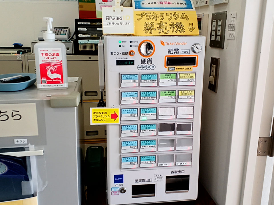 - プラネタリウムをご覧になるためにはチケットが必要です。チケットは、水の館3階の事務室にある券売機で購入してください。中学生以下の方も、券売機で無料券をお求めください。